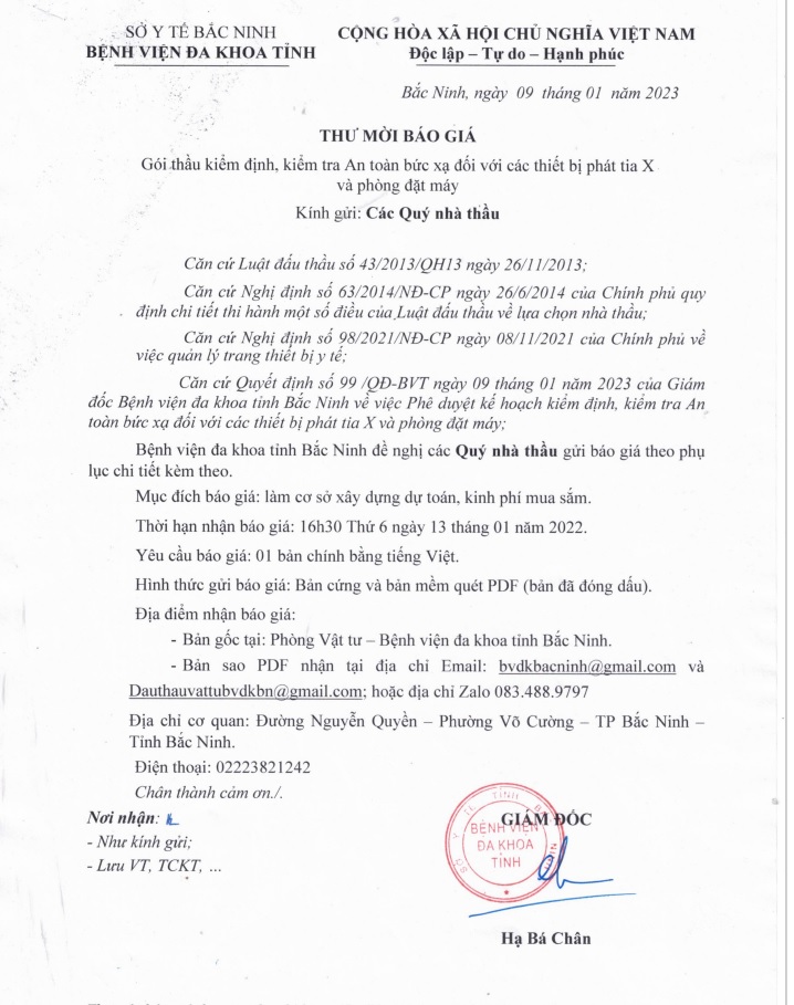 Thư mời báo giá Gói thầu kiểm định, kiểm tra An toàn bức xạ đối với các thiết bị phát tia X và phòng đặt máy