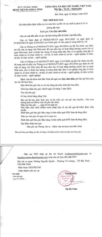 Thư mời báo giá Gói thầu kiểm định, kiểm tra An toàn bức xạ đối với các thiết bị phát tia X và phòng đặt máy