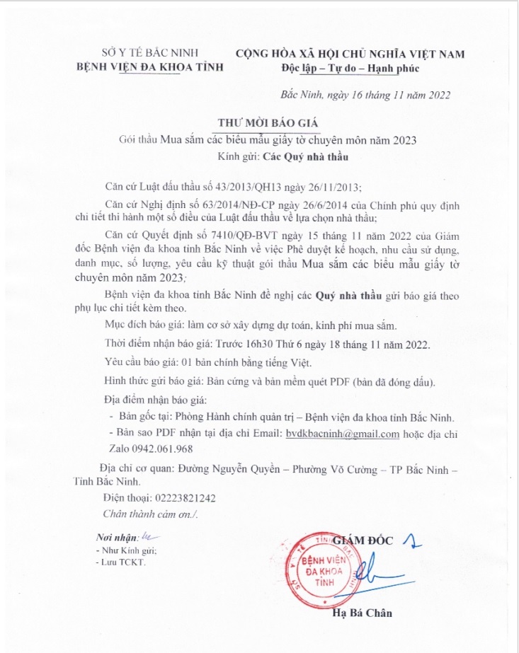 Thư mời báo giá Gói thầu Mua sắm các biểu mẫu giấy tờ chuyên môn năm 2023