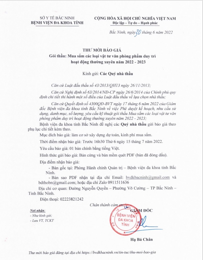 THƯ MỜI BÁO GIÁ Gói thầu: Mua sắm các loại vật tư văn phòng phẩm duy trì hoạt động thường xuyên năm 2022-2023