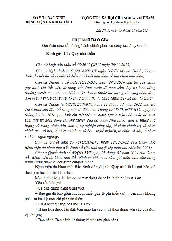Thư mời báo giá Gói thầu mua sắm hàng hành chính phục vụ công tác chuyên môn