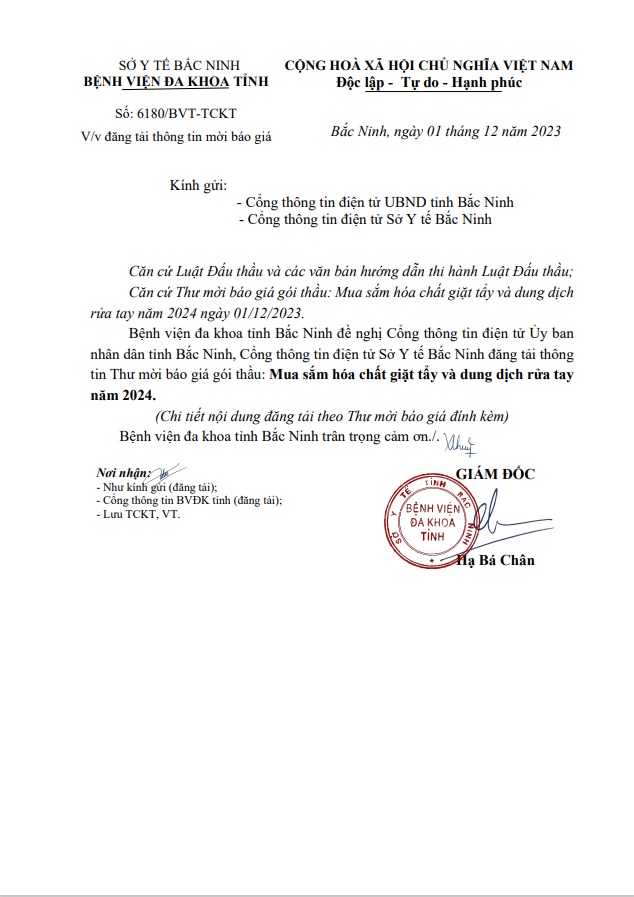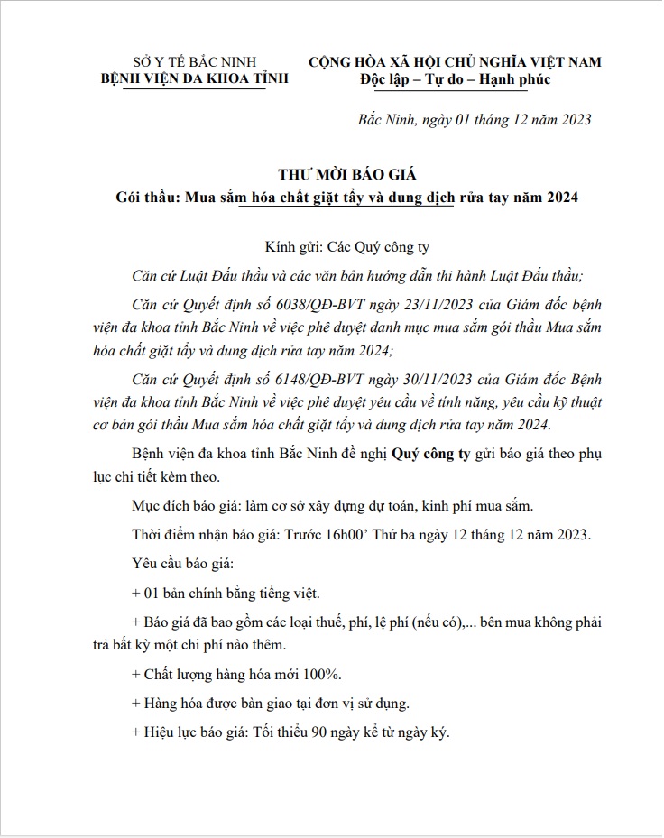Thư mời báo giá Gói thầu: Mua sắm hoá chất giặt tẩy và dung dịch rửa tay năm 2024