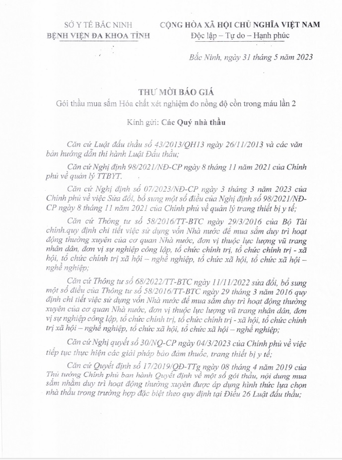 Thư mời báo giá Gói thầu mua sắm Hoá chất xét nghiệm đo nồng độ cồn trong máu lần 2
