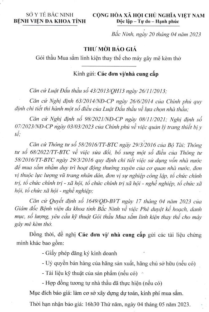 Thư mời báo giá: Gói thầu Mua sắm linh kiện thay thế cho máy gây mê kèm thở