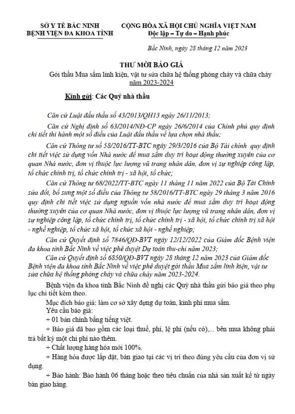 Thư mời báo giá Gói thầu Mua sắm linh kiện, vật tư sửa chữa hệ thống phòng cháy và chữa cháy năm 2023-2024