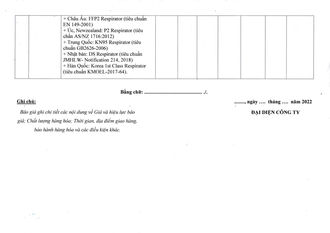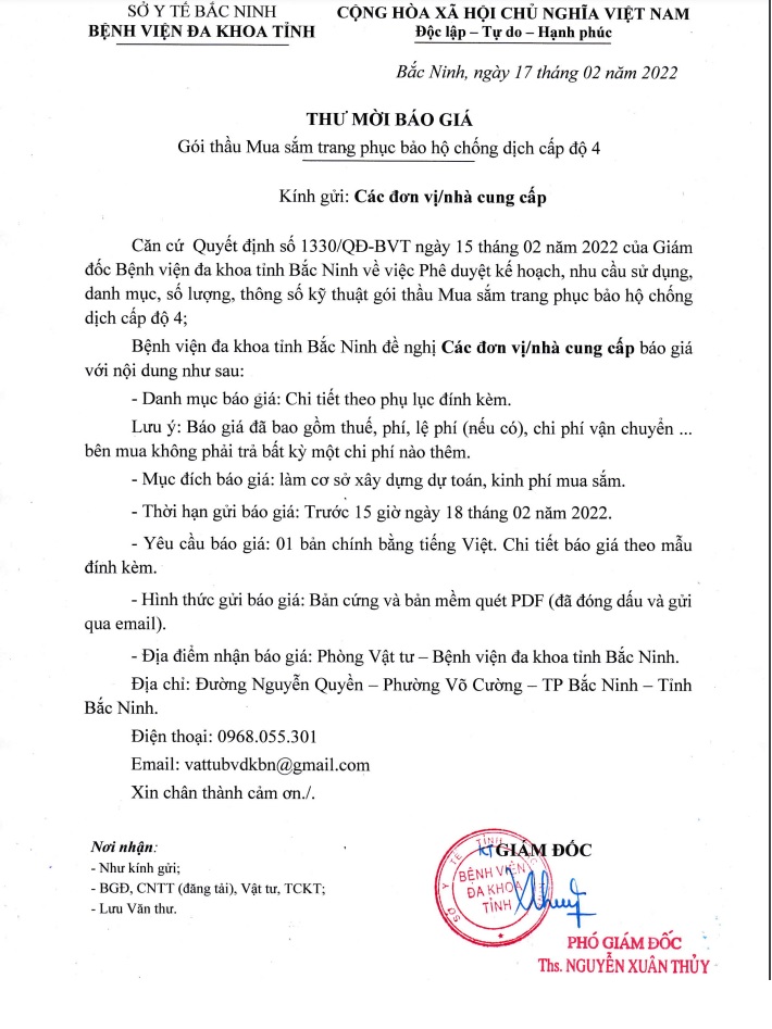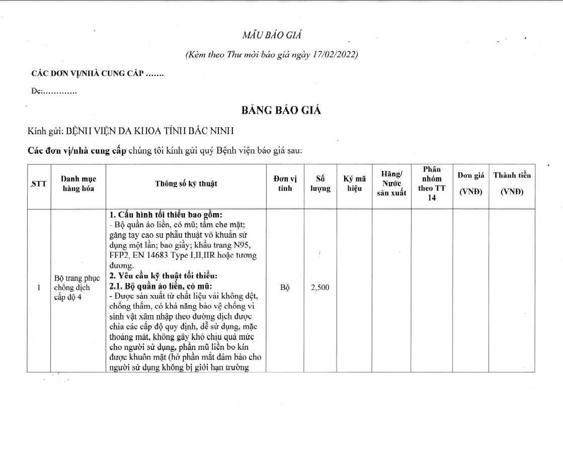 THƯ MỜI BÁO GIÁ GÓI THẦU MUA SẮM THANG PHỤC BẢO HỘ CHỐNG DỊCH CẤP ĐỘ 4