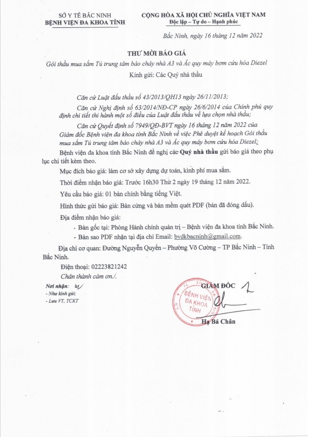 Thư mời báo giá Gói thầu mua sắm Tủ trung tâm báo cháy nhà A3 và Ắc quy máy bơm cứu hoả Diezel