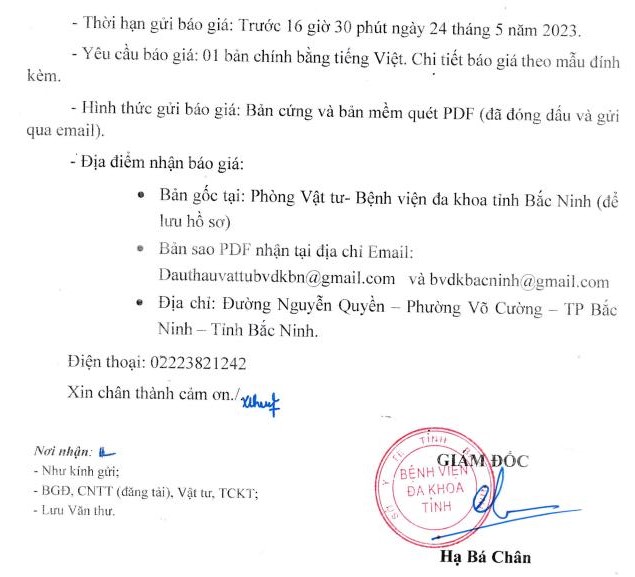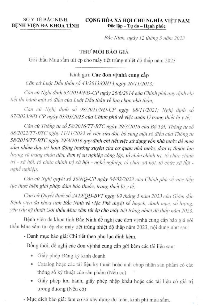 Thư mời báo giá: Gói thầu Mua sắm túi ép cho máy tiệt trùng nhiệt độ thấp năm 2023