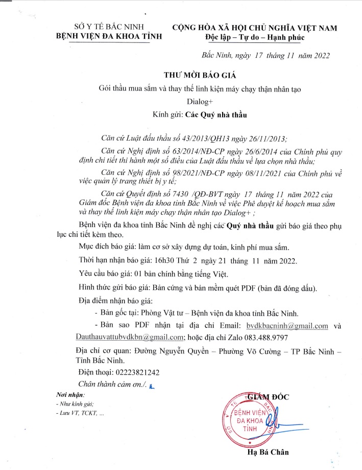 Thư mời báo giá Gói thầu mua sắm và thay thế linh kiện máy chạy thận nhân tạo Dialog
