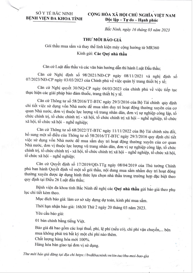 Thư mời báo giá Gói thầu mua sắm và thay thế linh kiện máy cộng hưởng từ MR360