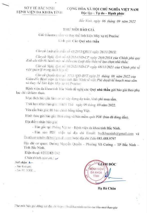 THƯ MỜI BÁO GIÁ: GÓI THẦU MUA SẮM VÀ THAY THẾ LINH KIỆN MÁY XẠ TRỊ PRECISE