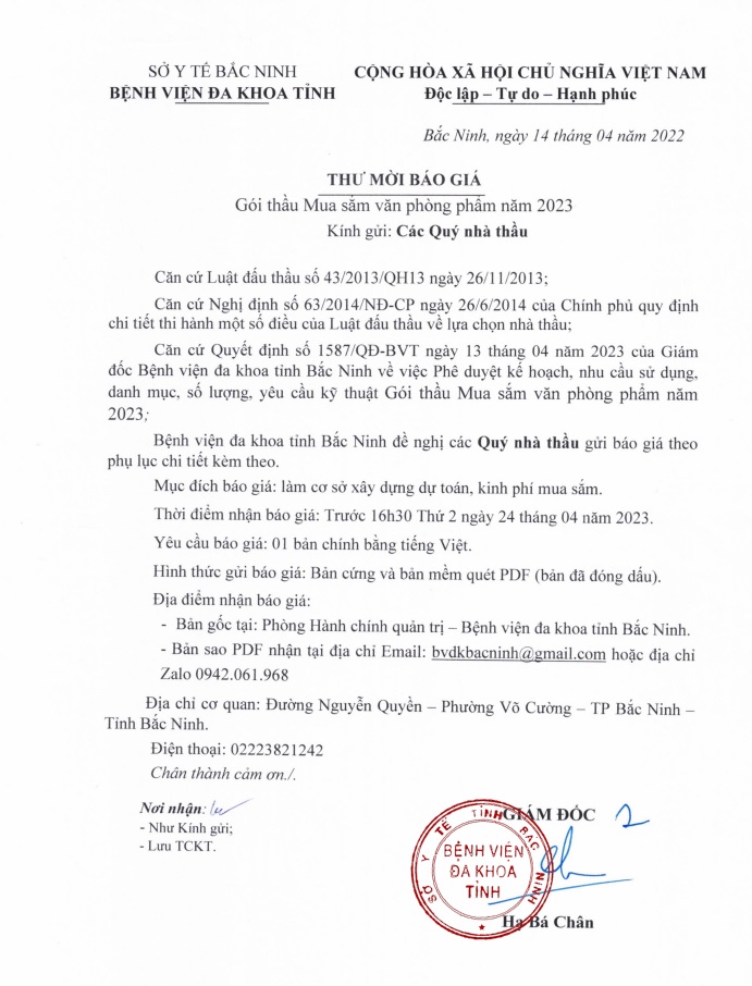 Thư mời báo giá Gói thầu Mua sắm văn phòng phẩm năm 2023
