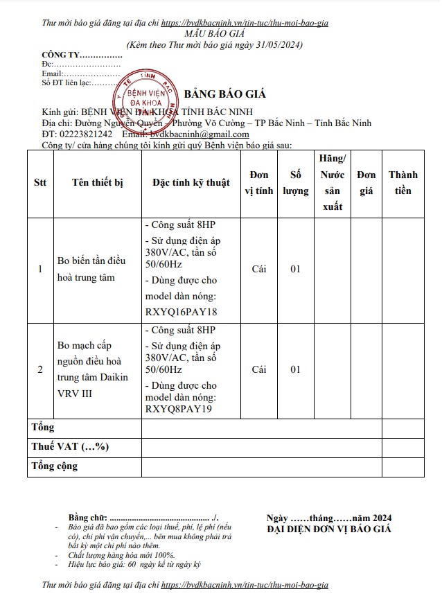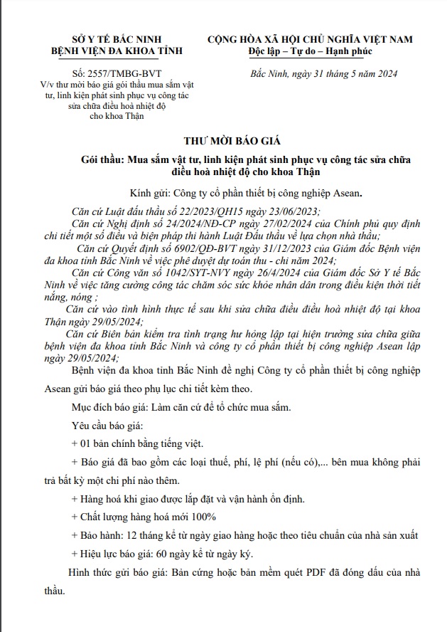 Thư mời báo giá gói thầu mua sắm vật tư, linh kiện phát sinh phục vụ công tác sửa chữa điều hoà nhiệt độ cho khoa Thận