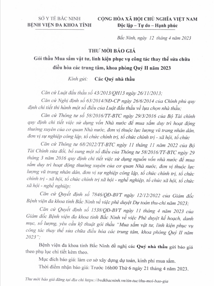 Thư mời báo giá Gói thầu Mua sắm vật tư, linh kiện phục vụ công tác thay thế sửa chữa điều hoà các trung tâm, khoa phòng Quý II năm 2023