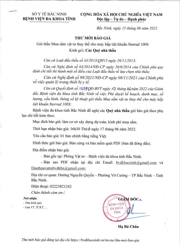 THƯ MỜI BÁO GIÁ GÓI THẦU MUA SẮM VẬT TƯ THAY THẾ CHO MÁY HẤP TIỆT KHUẨN STERRAD 100S