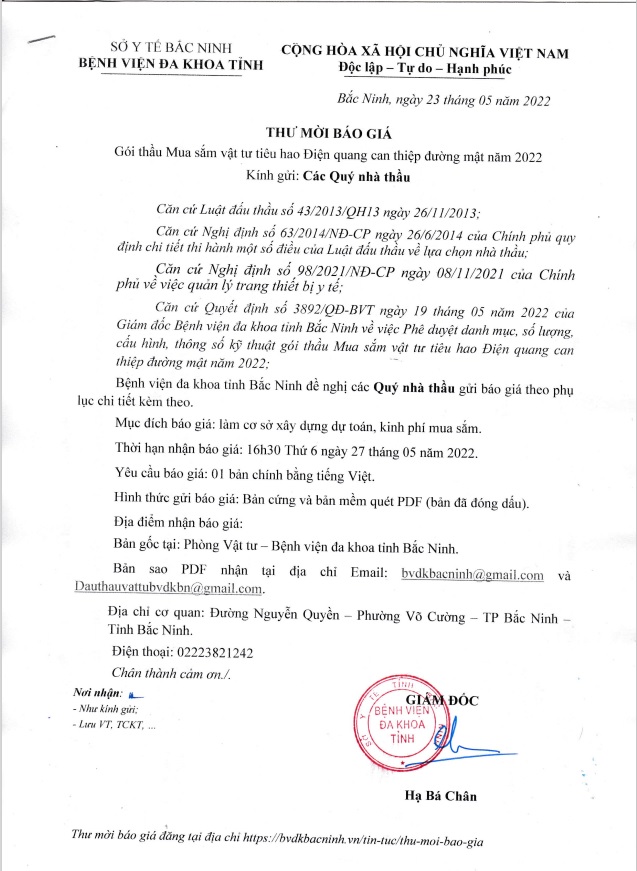 Thư mời báo giá Gói thầu Mua sắm vật tư tiêu hao Điện quang can thiệp đường mật năm 2022