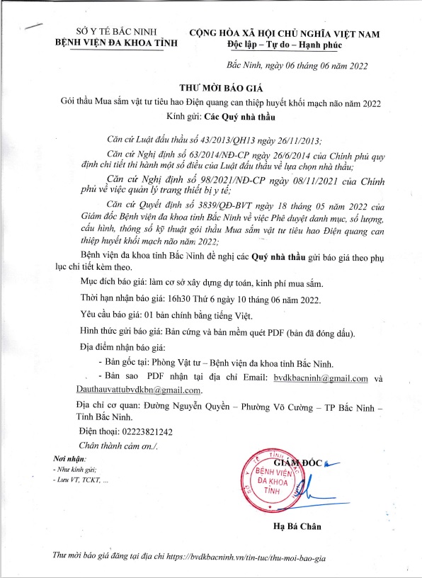 Thư mời báo giá Gói thầu Mua sắm vật tư tiêu hao Điện quang can thiệp huyết khối mạch não năm 2022