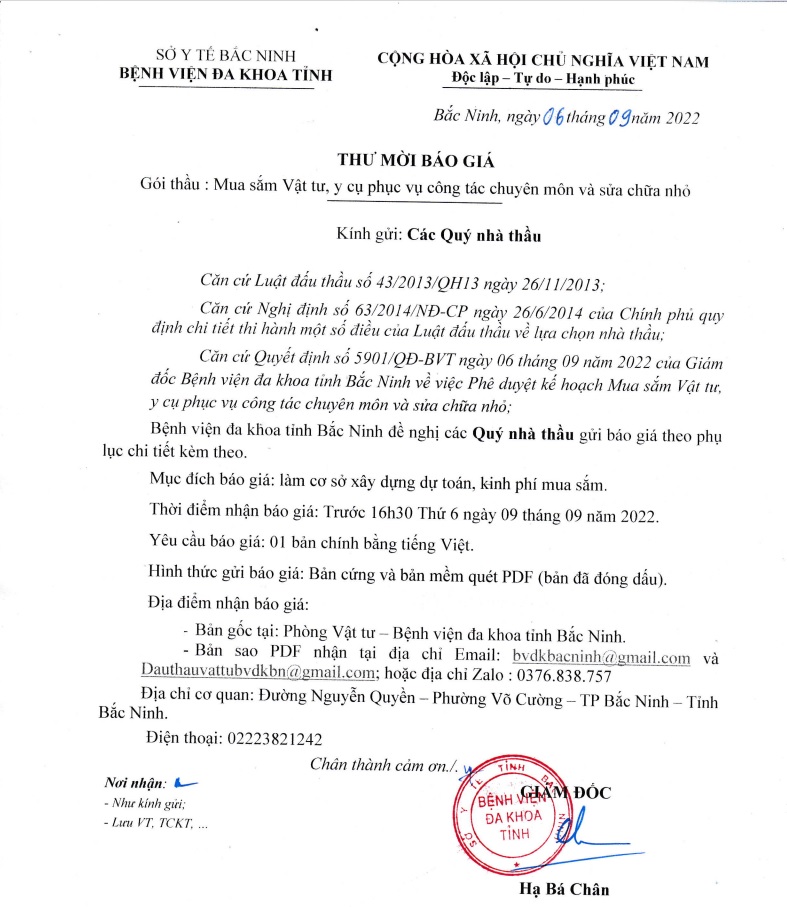 Thư mời báo giá Gói thầu: Mua sắm Vật tư, y cụ phục vụ công tác chuyên môn và sửa chữa nhỏ