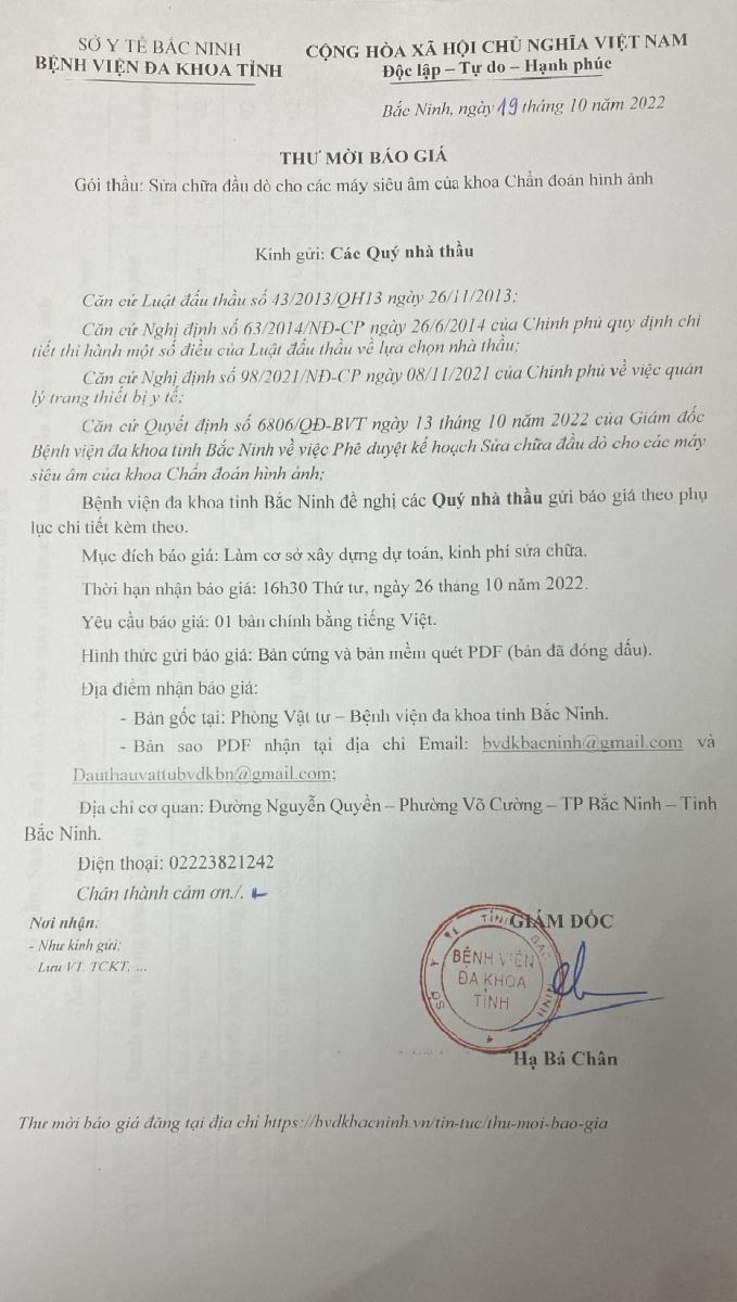 THƯ MỜI BÁO GIÁ Gói thầu: Sửa chữa đầu dò cho các máy siêu âm của khoa Chẩn đoán hình ảnh
