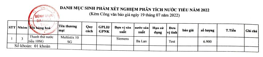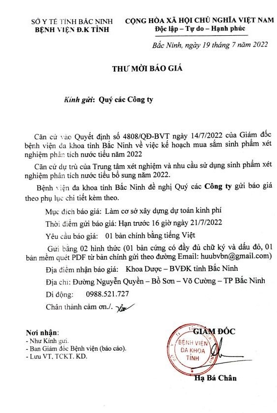 THƯ MỜI BÁO GIÁ: KẾ HOẠCH MUA SẮM SINH PHẨM XÉT NGHIỆM PHÂN TÍCH NƯỚC TIỂU NĂM 2022