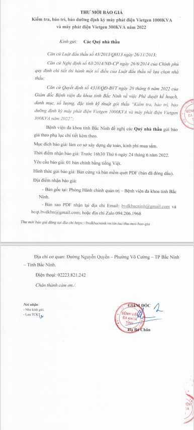 THƯ MỜI BÁO GIÁ: Kiểm tra, bảo trì, bảo dưỡng định kỳ máy phát điện Vietgen 1000KVA và máy phát điện Vietgen 300KVA năm 2022