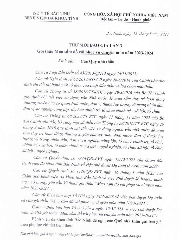 Thư mời báo giá lần 3 Gói thầu Mua sắm đồ vải phục vụ chuyên môn năm 2023-2024