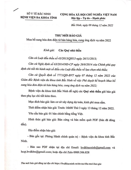 Thư mời báo giá Mua bổ sung hoá đơn điện tử bán hàng hoá, cung ứng dịch vụ năm 2022