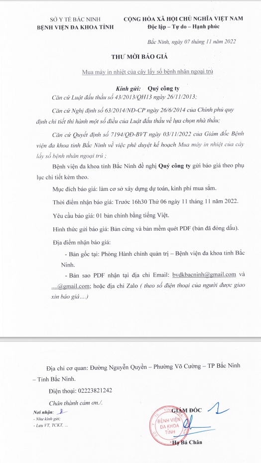 THƯ MỜI BÁO GIÁ Mua máy in nhiệt của cây lấy số bệnh nhân ngoại trú