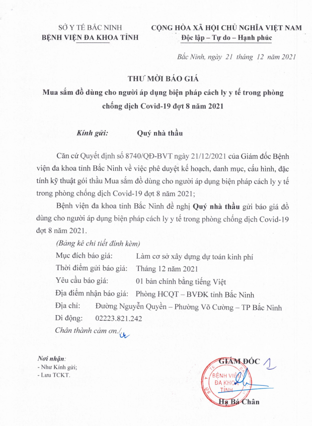 Thư mời báo giá Mua sắm đồ dùng cho người áp dụng biện pháp cách ly y tế trong phòng chống dịch Covid-19 đợt 8 năm 2021