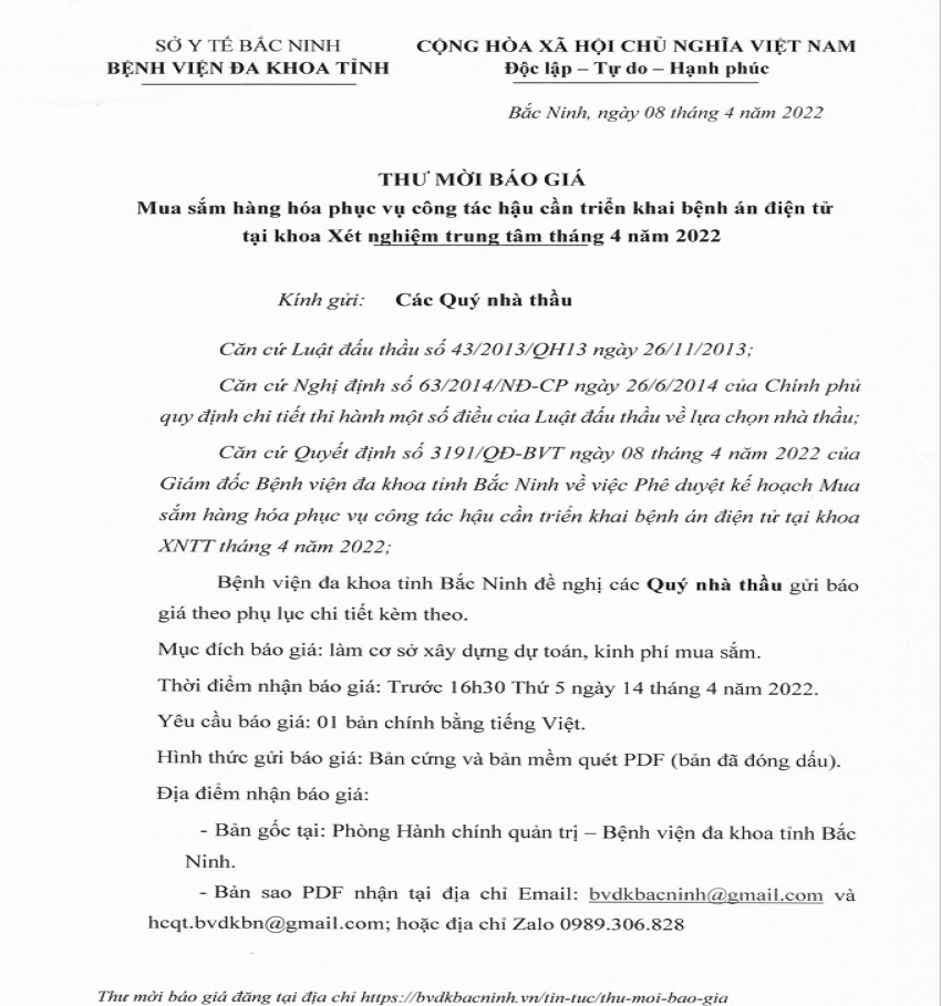 THƯ MỜI BÁO GIÁ Mua sắm hàng hoá phục vụ công tác hậu cần triển khai bệnh án điện tử tại khoa Xét nghiệm trung tâm tháng 4 năm 2022