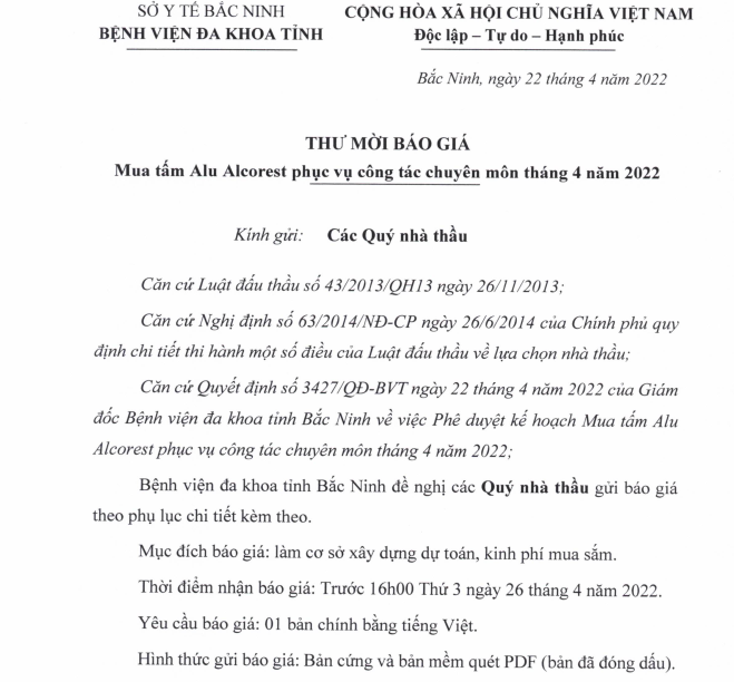 Thư mời báo giá Mua tấm Alu Alcorest phục vụ công tác chuyên môn tháng 4 năm 2022
