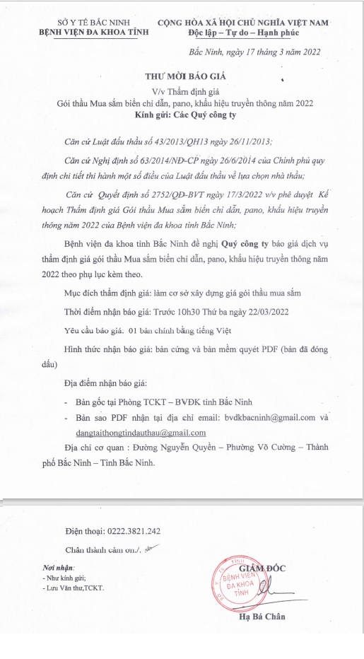 THƯ MỜI BÁO GIÁ V/v THẨM ĐỊNH GIÁ GÓI THẦU MUA SẮM BIỂN CHỈ DẪN, PANO, KHẨU HIỆU TRUYỀN THÔNG NĂM 2022