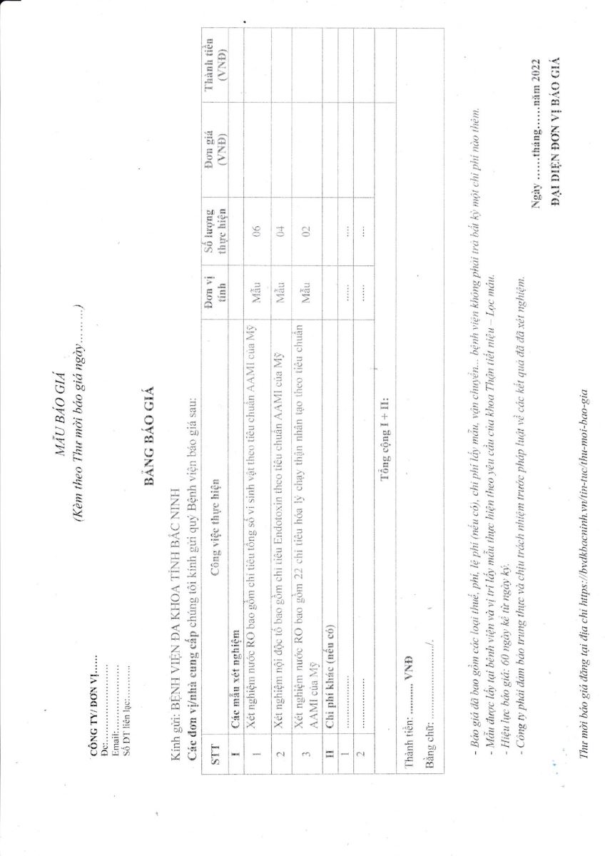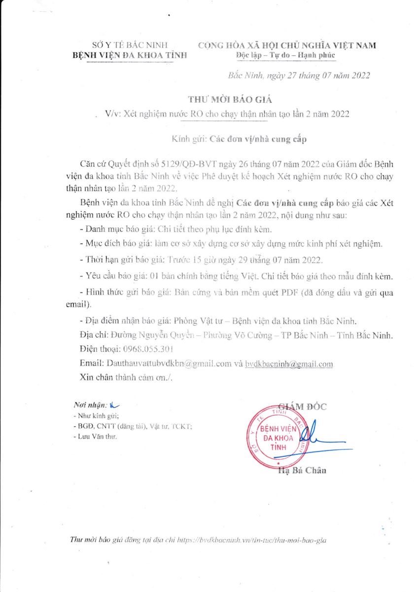 Thư mời báo giá Xét nghiệm nước RO cho chạy thận nhân tạo lần 2 năm 2022