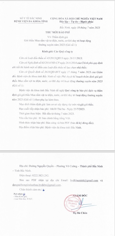 Thư mời báo phí V/v Thẩm định giá Gói thầu Mua sắm vật tư điện, nước, cơ khí duy trì hoạt động thường xuyên năm 2023 ( Gói số 1)