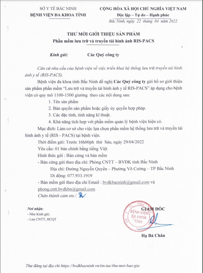 THƯ MỜI GIỚI THIỆU SẢN PHẨM: Phần mềm lưu trữ và truyền tải hình ảnh RIS-PACS