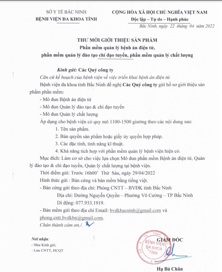 THƯ MỜI GIỚI THIỆU SẢN PHẨM: Phần mềm quản lý bệnh án điện tử, phần mềm quản lý đào tạo chỉ đạo tuyến, phần mềm quản lý chất lượng