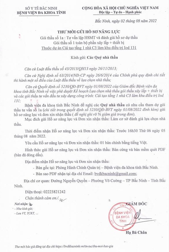 THƯ MỜI GỬI HỒ SƠ NĂNG LỰC GÓI THẦU SỐ 1A: TƯ VẤN LẬP HSMT VÀ ĐÁNH GIÁ HỒ SƠ DỰ THẦU GÓI THẦU SỐ 1 TOÀN BỘ PHẦN XÂY LẮP THIẾT BỊ THUỘC DỰ ÁN CẢI TẠO TẦNG 1 NHÀ C3 LÀM KHU ĐIỀU TRỊ IOD 131
