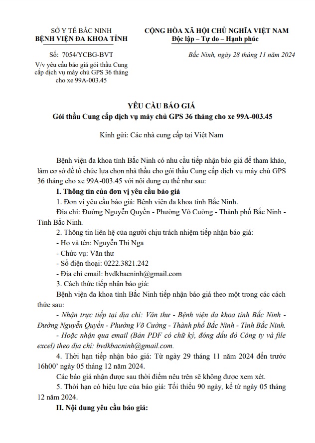 Yêu cầu báo giá Gói thầu Cung cấp dịch vụ máy chủ GPS 36 tháng cho xe 99A-003.45