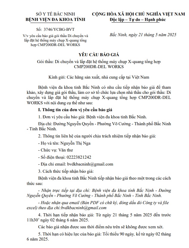 Yêu cầu báo giá gói thầu Di chuyển và lắp đặt hệ thống máy chụp X-quang tổng hợp CMP200DR-DEL WORKS