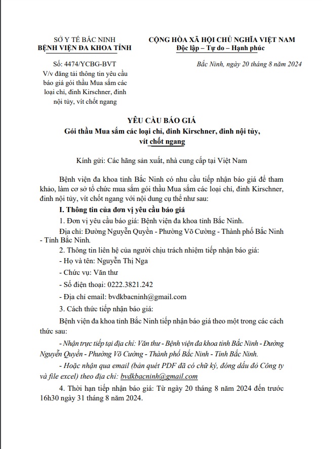 Yêu cầu báo giá gói thầu mua sắm các loại chỉ, đinh Kirschner, đinh nội tuỷ, vít chốt ngang