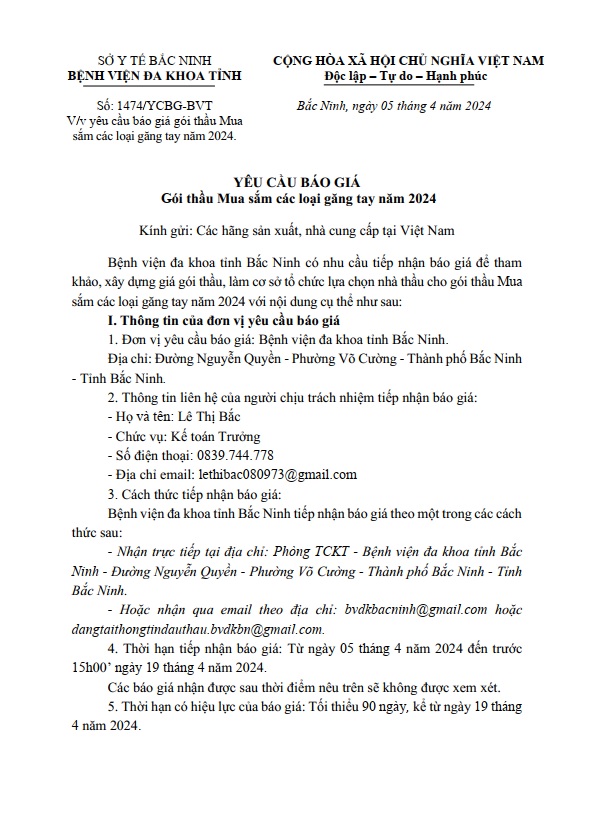 Yêu cầu báo giá Gói thầu Mua sắm các loại găng tay năm 2024