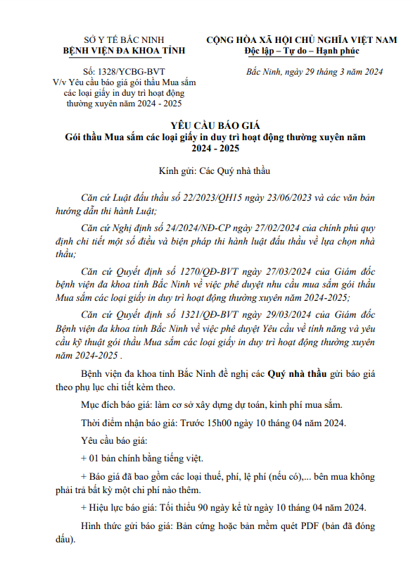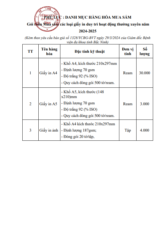 Yêu cầu báo giá gói thầu Mua sắm các loại giấy in duy trì hoạt động thường xuyên năm 2024 - 2025
