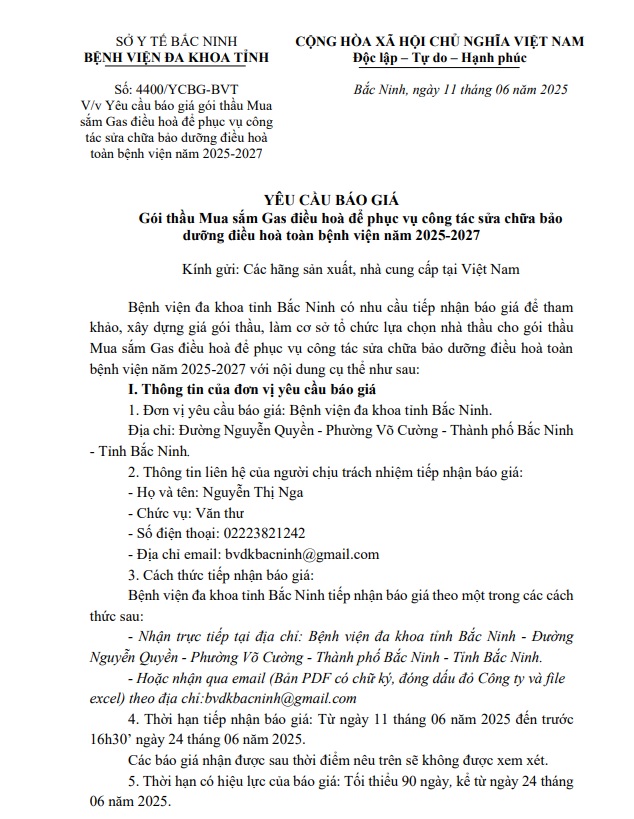 Yêu cầu báo giá gói thầu Mua sắm Gas điều hoà để phục vụ công tác sửa chữa bảo dưỡng điều hoà toàn bệnh viện năm 2025-2027