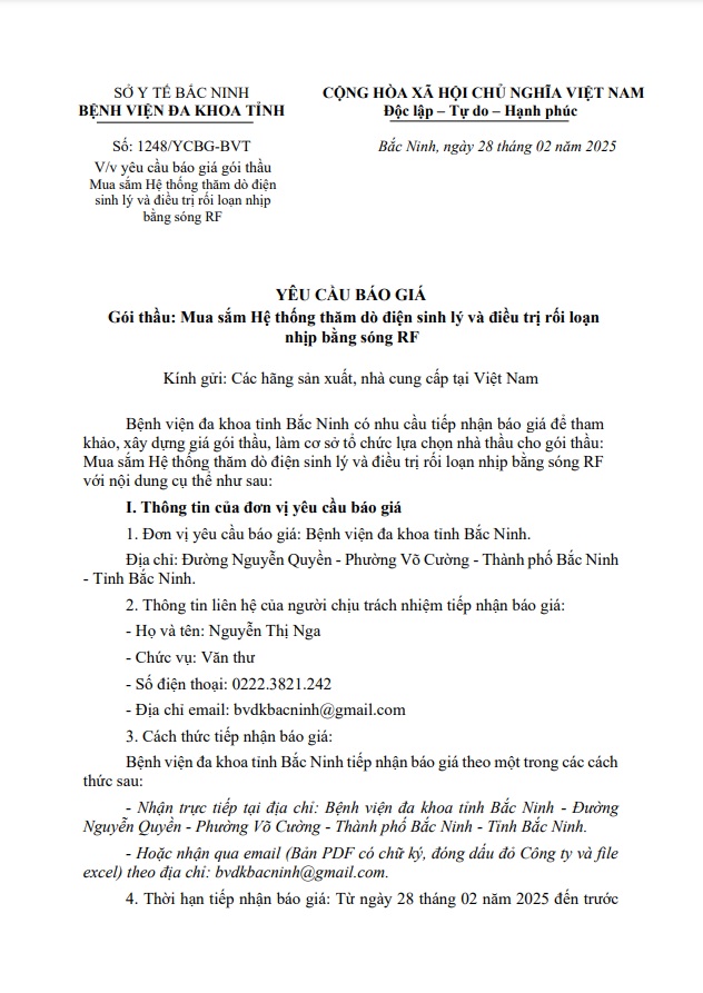 Yêu cầu báo giá gói thầu Mua sắm Hệ thống thăm dò điện sinh lý và điều trị rối loạn nhịp bằng sóng RF