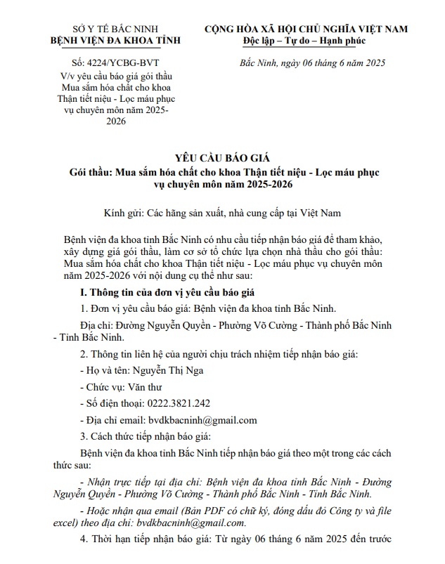 Yêu cầu báo giá gói thầu Mua sắm hóa chất cho khoa Thận tiết niệu - Lọc máu phục vụ chuyên môn năm 2025-2026