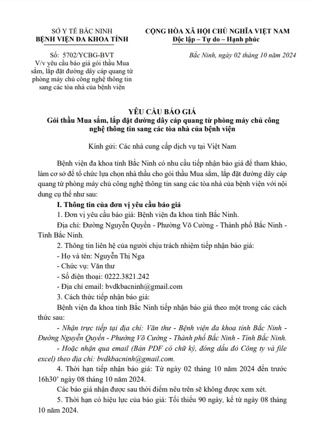 Yêu cầu báo giá gói thầu Mua sắm, lắp đặt đường dây cáp quang từ phòng máy chủ công nghệ thông tin sang các toà nhà của Bệnh viện