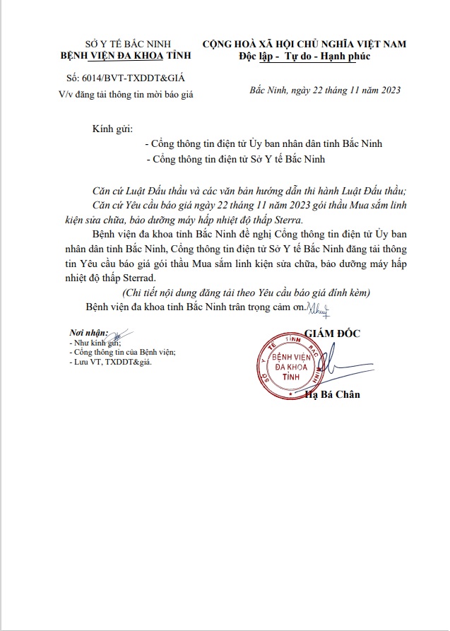 THƯ MỜI BÁO GIÁ V/v Thẩm định giá Gói thầu Dịch vụ vệ sinh công nghiệp bệnh viện năm 2022-2023