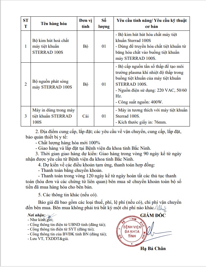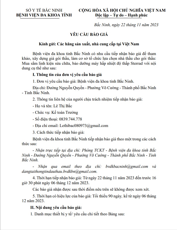 Yêu cầu báo giá Gói thầu: Mua sắm linh kiện sửa chữa, bảo dưỡng máy hấp nhiệt độ thấp Sterrad