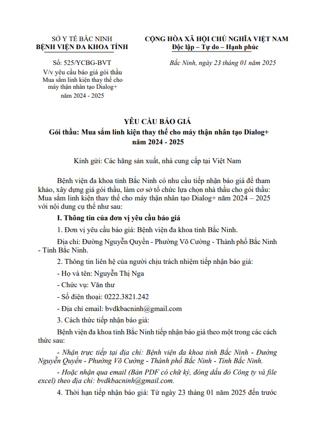 Yêu cầu báo giá gói thầu Mua sắm linh kiện thay thế cho máy thận nhân tạo Dialog năm 2024 - 2025