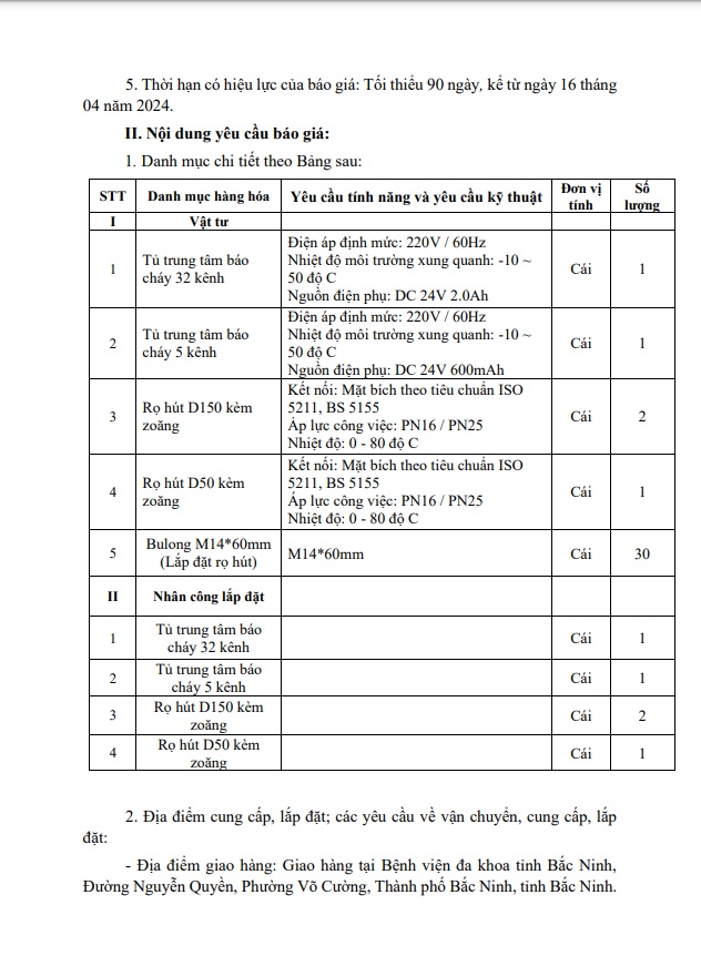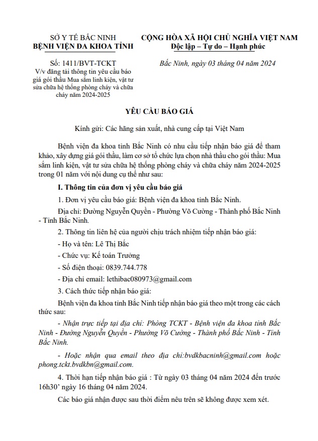 Yêu cầu báo giá gói thầu Mua sắm linh kiện, vật tư sửa chữa hệ thống phòng cháy và chữa cháy năm 2024-2025